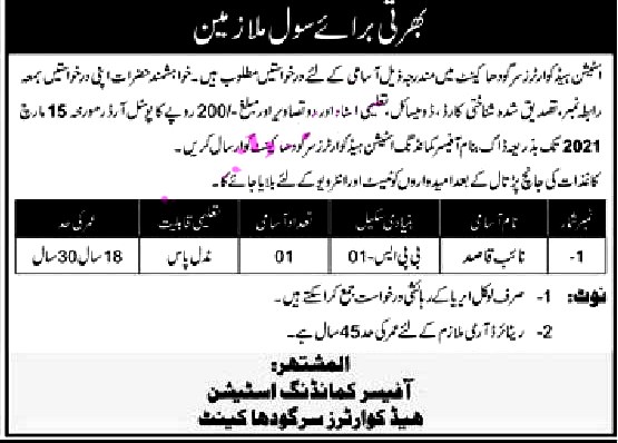 Government of the Punjab Pakistan Army Station Head Quarter Sargodha 2021 Latest New Jobs For Naib Qasid : This Ad is Published in Jang News Paper on 10-March-2021: Last date submission Application 15-March-2021: